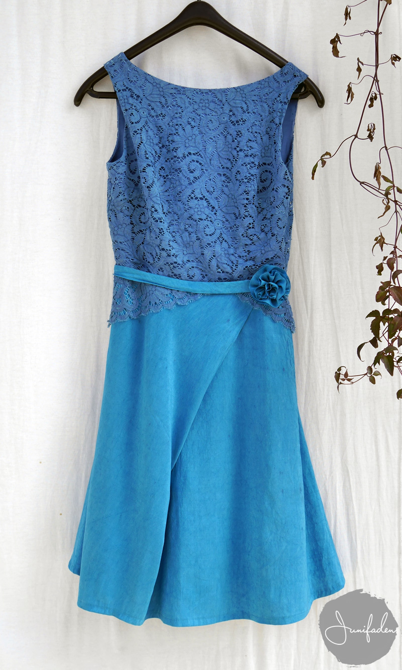 von links nach rechts: das Kleid wie es ursprünglich war / nach dem Färben / nach dem Kürzen